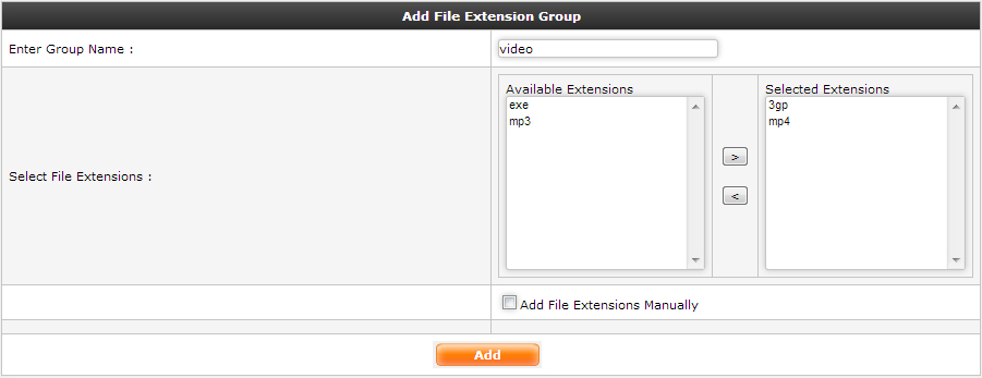 You can add the file extensions to the group by selecting them from existing file extensions list or by manually entering values in the text area provided below. You can enter multiple file extensions separated by comma(',').