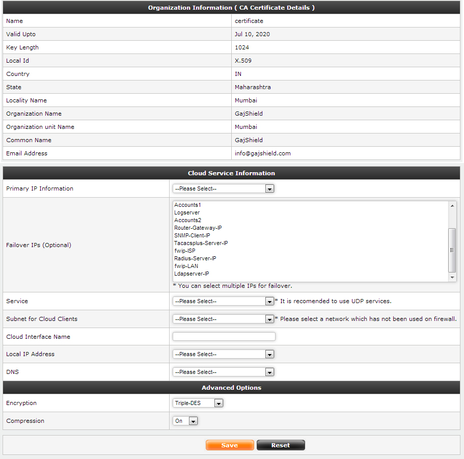 ● Encryption: Data is encrypted between the Cloud client and GajShield firewall, using (Blowfish, AES & Triple-DES). Select any one from the drop down list.