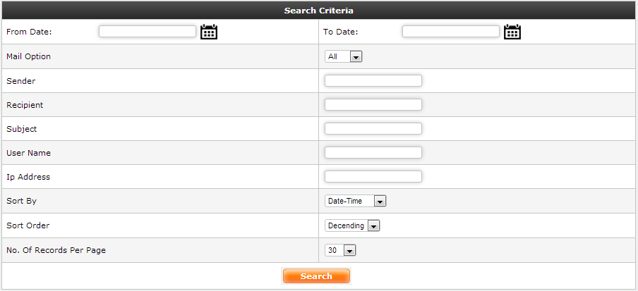 You can specify the search criteria for the uploaded files, like, From Date , To Date , Sender, Recipient , Subject , User Name , and IP .