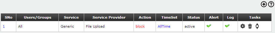 This screen shows the summary of the DLP Rules on your DLP enabled firewall. You can add, edit, delete or move rules using this screen. DLP Rules help in filtering traffic based on its content rather than only its source or destination. Clicking on the Sr.No of the Rule, would show you the match filters of the rule. Clicking on the timeset mentioned under the TimeSet column would give you a detailed view of the timeset selected for the rule. The rule would be applicable within the time period mentioned in timeset. Under the tasks column you can click three buttons namely Edit Delete and Move for each rules respectively.