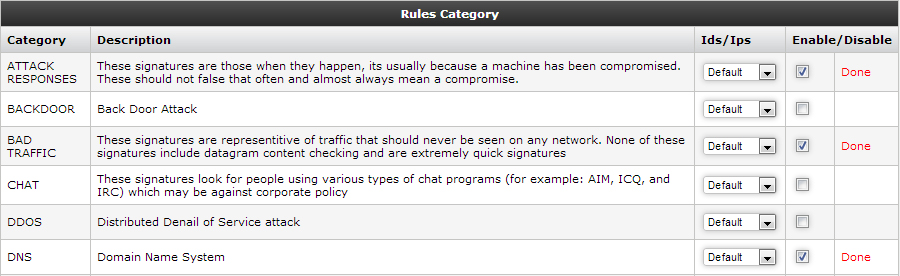 Default : by default the all the signature in the category is enabled and you can define specific signatures in that sub-group to be in either 'Alert Mode' or 'Drop Mode'