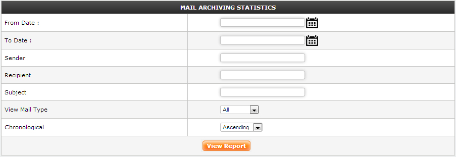 In Mail Archiving Report , select "From date" and "To date" which you want to display Mail Archiving report. Some filters are available like "Sender" , "Recipient", "Subject" and "View Mail Type" .
