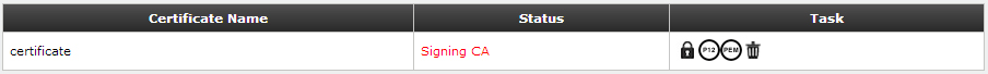 The Tasks subsection allows a particular certificate to be either downloaded or deleted. The certificate can be downloaded as a PEM or as a p12(pkcs#12 file format) file.