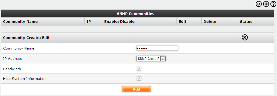 Shows the different SNMP communities which have been configured. This menu allows you to define community name, the IP Address/ Network which would be able to query the SNMP server running on your firewall and the access is always read-only.