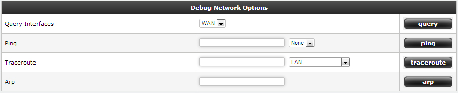 The Debug Network option provides a rudimentary set of network tools that can be used from the web interface which includes ping, traceroute and arp. The results displayed helps checking network connectivity For ping DNS hostname or IP address and click Start. If you simply click on ARP it shows the ARP cache and for getting ARP of a specific system provide the IP address of that machine.