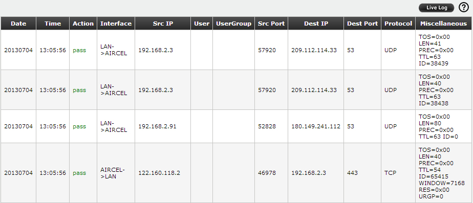 Shows the Current Firewall logs which illustrates the last 50 lines which would be automatically refreshed. For taking the Logs remotely to another machine use the Remote Log options or you can download the logs from Get Logs Options, unzip it and open it in excel sheet for further analysis. Please note that the data is available in text format with pipe separation.