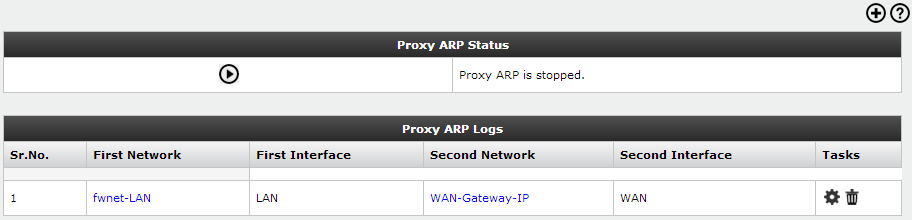 This screen has button to start and stop proxyarp. Under Proxy ARP, you can see the existing configuration of proxy ARP. You can add, edit or delete configuration using this screen.