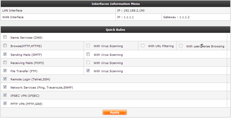 ● userSense: userSense will only be enabled once URL Filtering has been checked. If enabled from QuickSetup then Firewall will allow Browsing only by userSense Based Authentication.